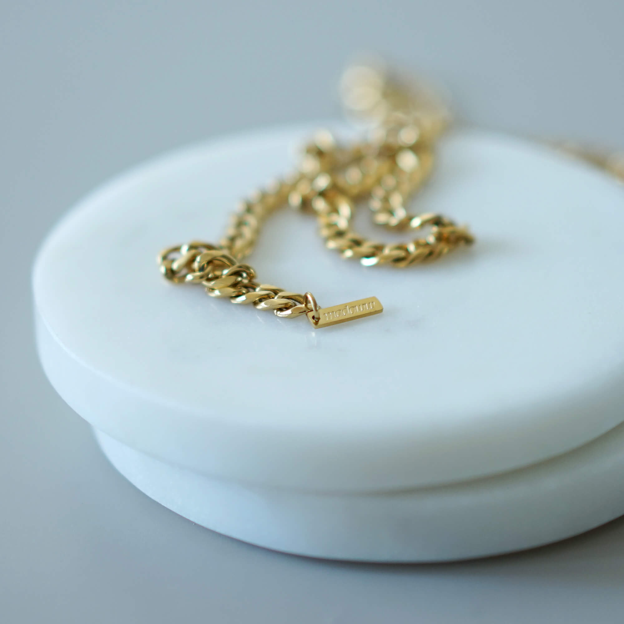 Dieses Armband ist nicht allein! Wir haben auch eine passende kubanische Halskette, die das Armband ergänzt und einen einheitlichen, stilvollen Look kreiert. Die Halskette besteht aus demselben hochwertigen Edelstahl und ist in den gleichen Farben wie das Armband erhältlich – 18 Karat vergoldet und versilbert.