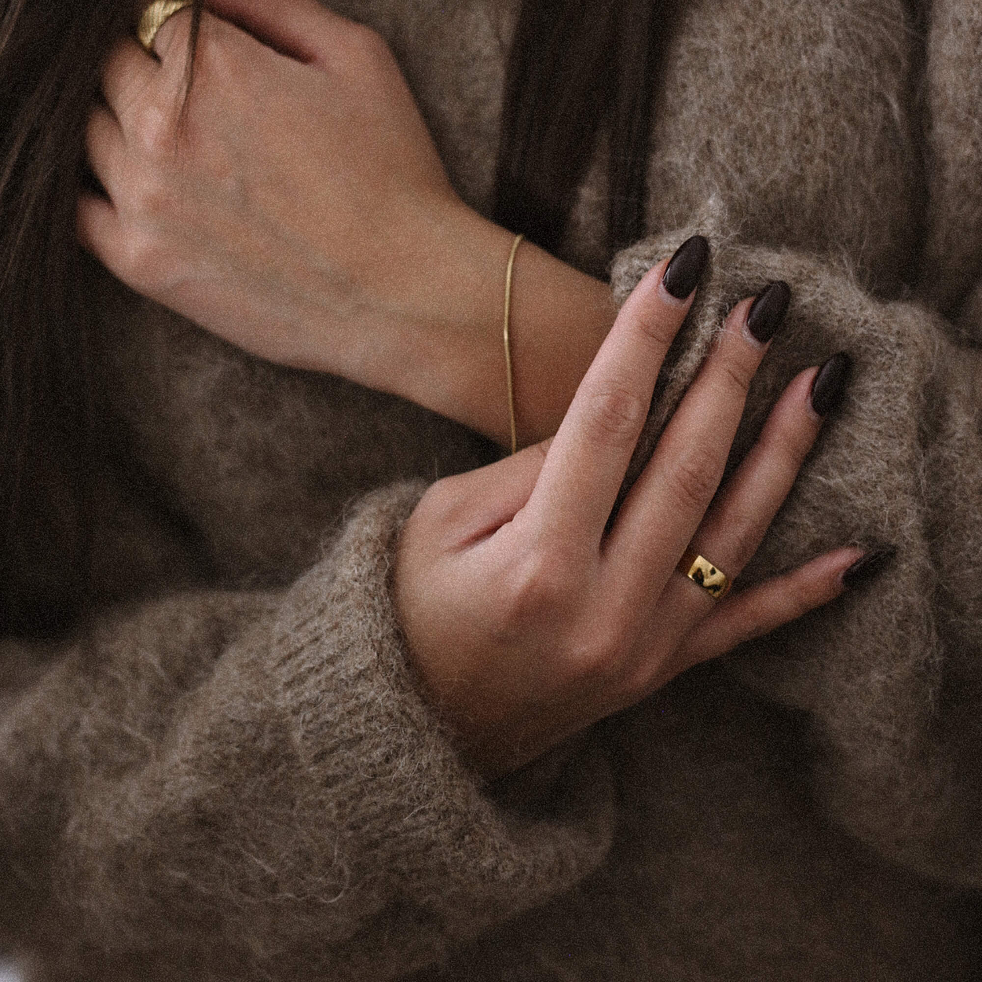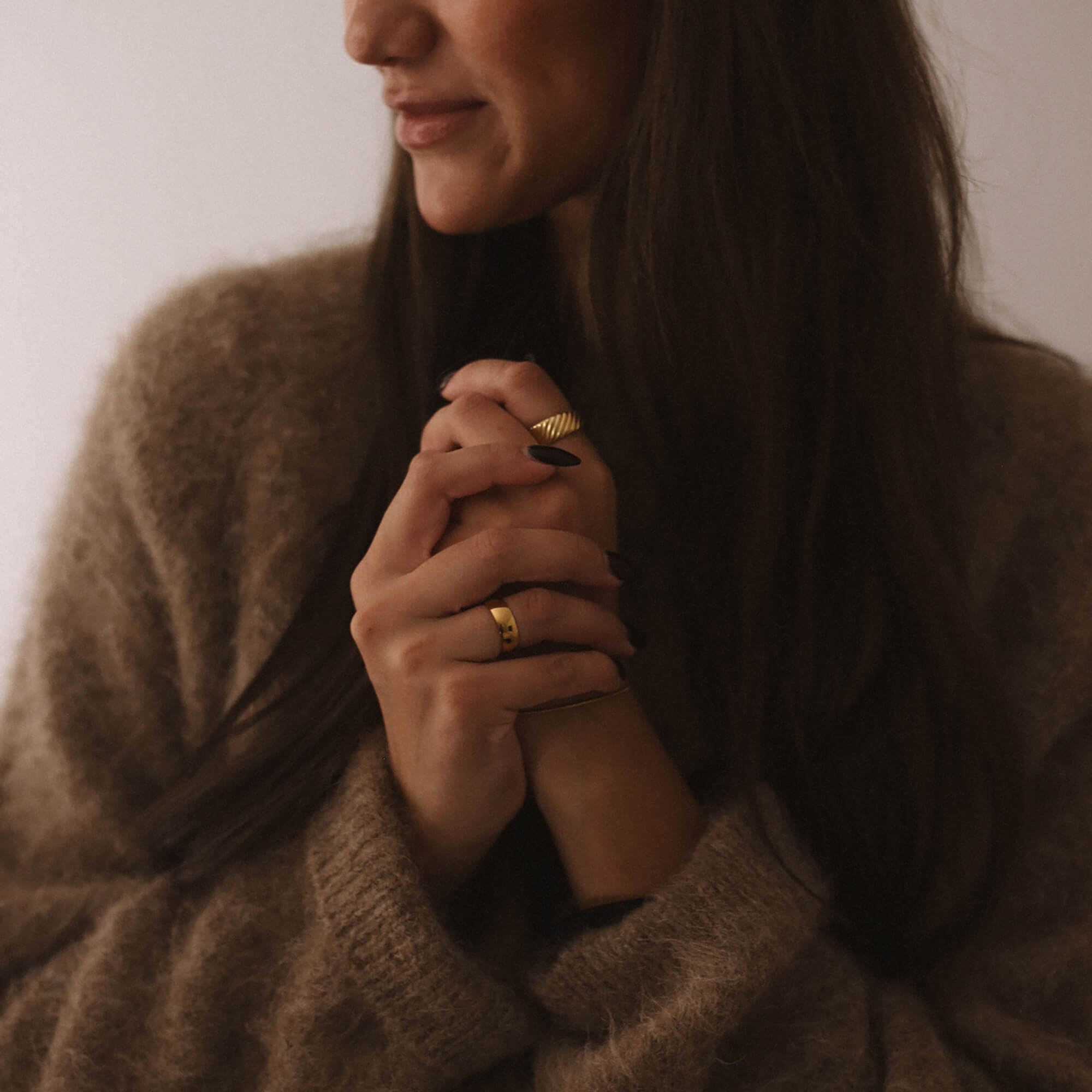 Der Ring besteht aus hochwertigem, vergoldetem Edelstahl, was seine Langlebigkeit und Haltbarkeit garantiert. Die goldene Oberfläche wird mithilfe der fortschrittlichen PVD-Technologie (Physical Vapor Deposition) erzeugt, wodurch die Vergoldung besonders widerstandsfähig und langlebig ist. So kannst du den Ring auch unter der Dusche und beim Sport unbesorgt tragen, ohne Angst haben zu müssen, dass er beschädigt wird.
