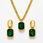 Die Lush-Halskette und die Ohrringe bilden ein auffälliges und dennoch dezentes Ensemble, das Alltagskleidung einen Hauch von Luxus verleiht und Party-Looks den letzten Schliff verleiht. Das Herzstück des Sets bilden grüne Zirkonia , die das Licht wunderschön einfangen und jeden Moment zu etwas Besonderem machen.