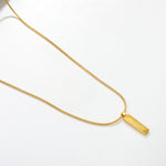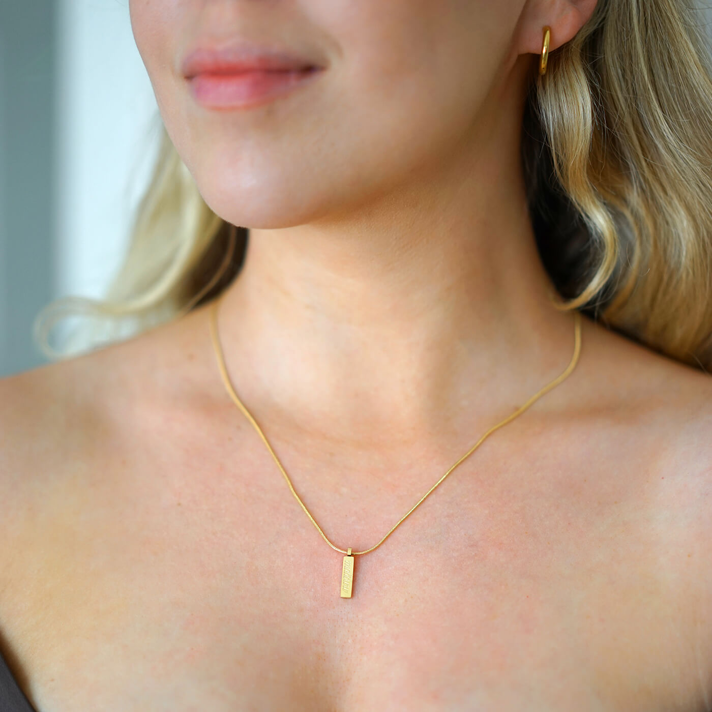 Die Tag-Halskette ist schlicht elegant und dennoch ein echter Hingucker. Der geradlinige, gravierte Plakettenanhänger und die anmutige vergoldete Kette bilden eine moderne Kombination, die sowohl minimalistische als auch trendbewusste Trägerinnen begeistert. Die perfekte Wahl für alle, die klares Design und langlebige Qualität schätzen.