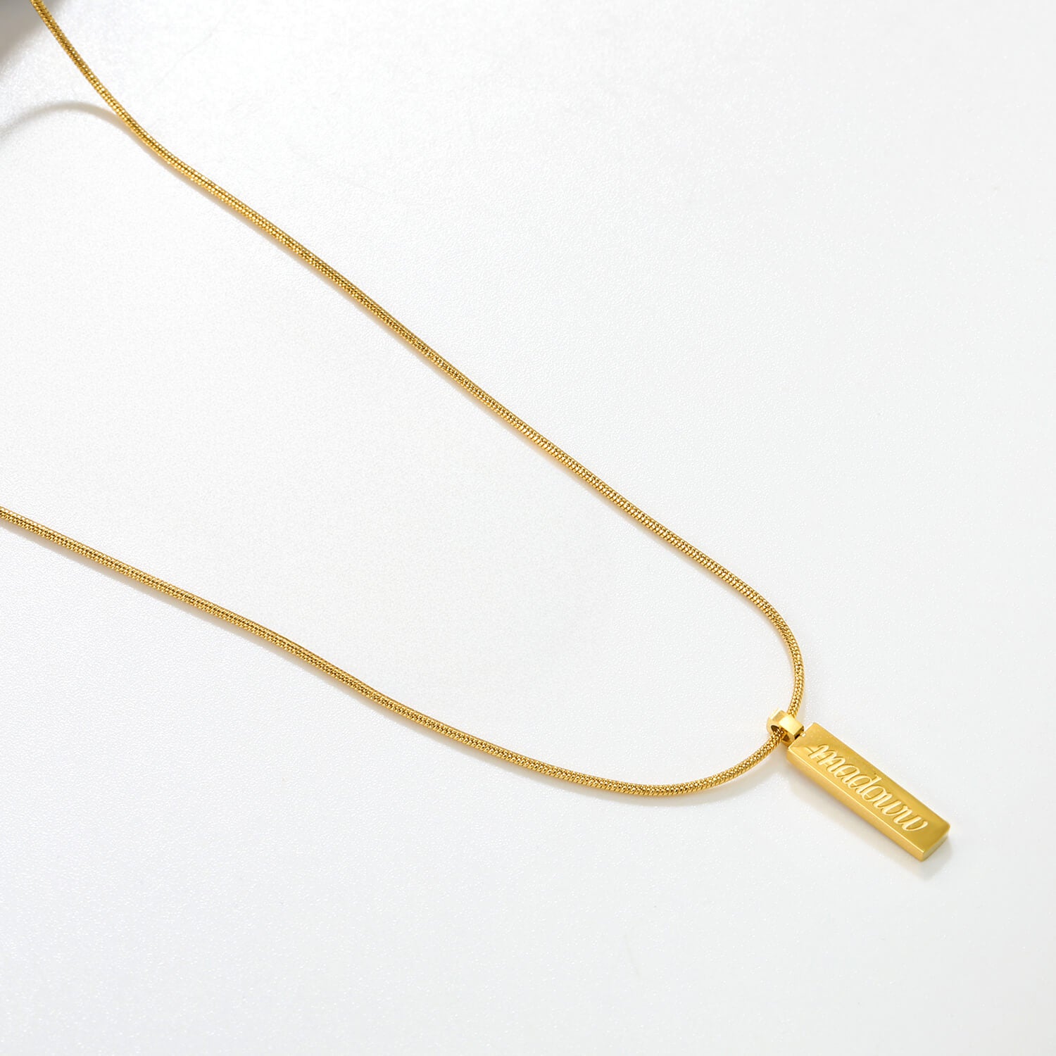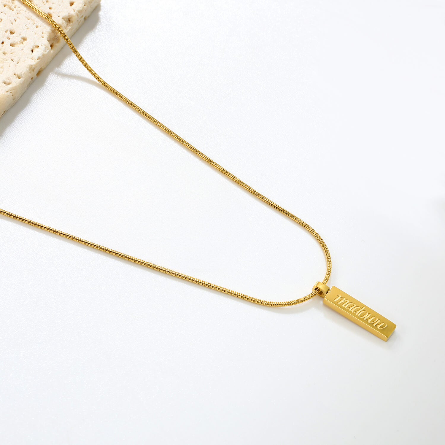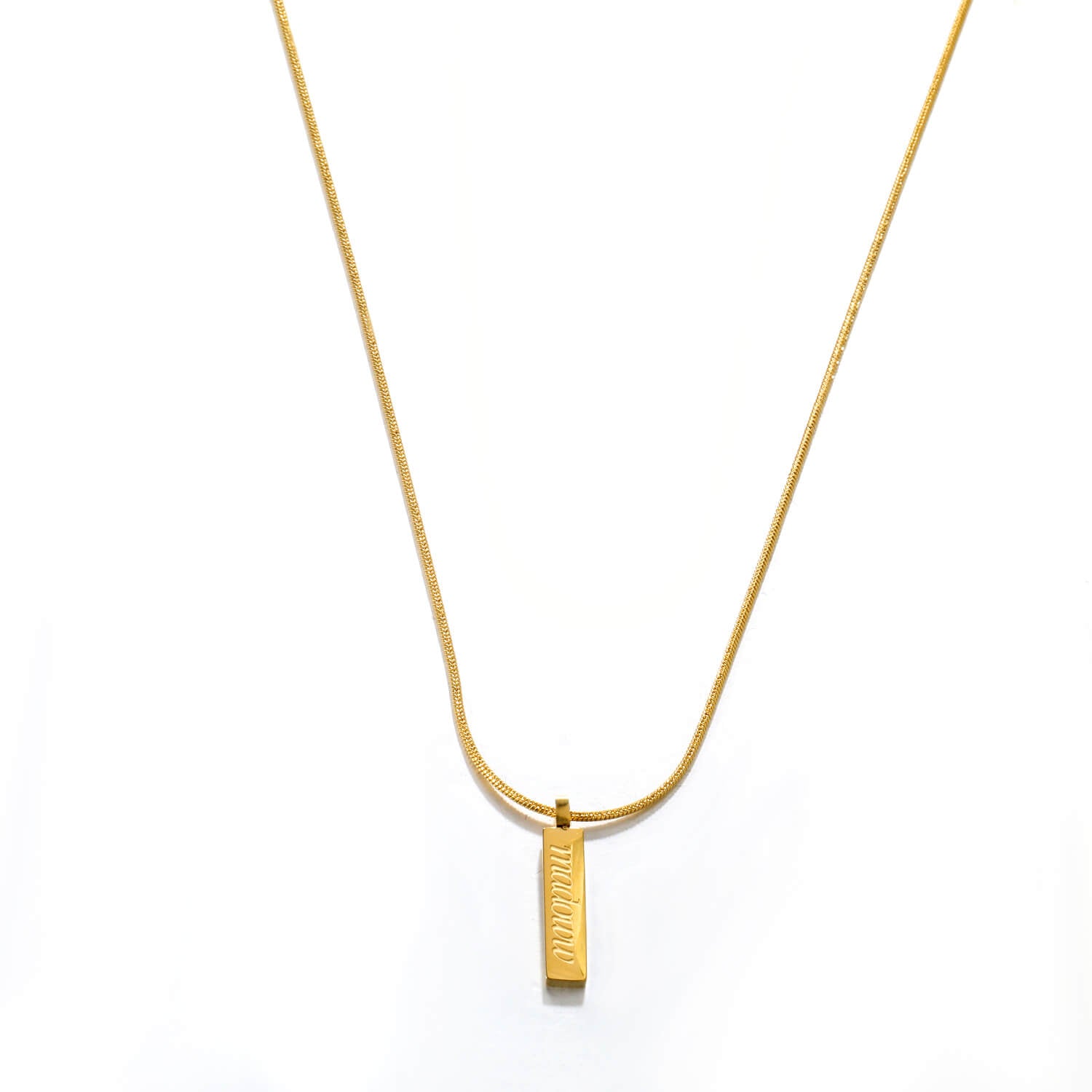 Die Kombination aus dünner Kette und rechteckigem Anhänger verleiht dem Schmuckstück einen modernen und eleganten Look. Das eingravierte madoww-Logo auf der Oberfläche des Anhängers verleiht ihm den letzten Schliff.