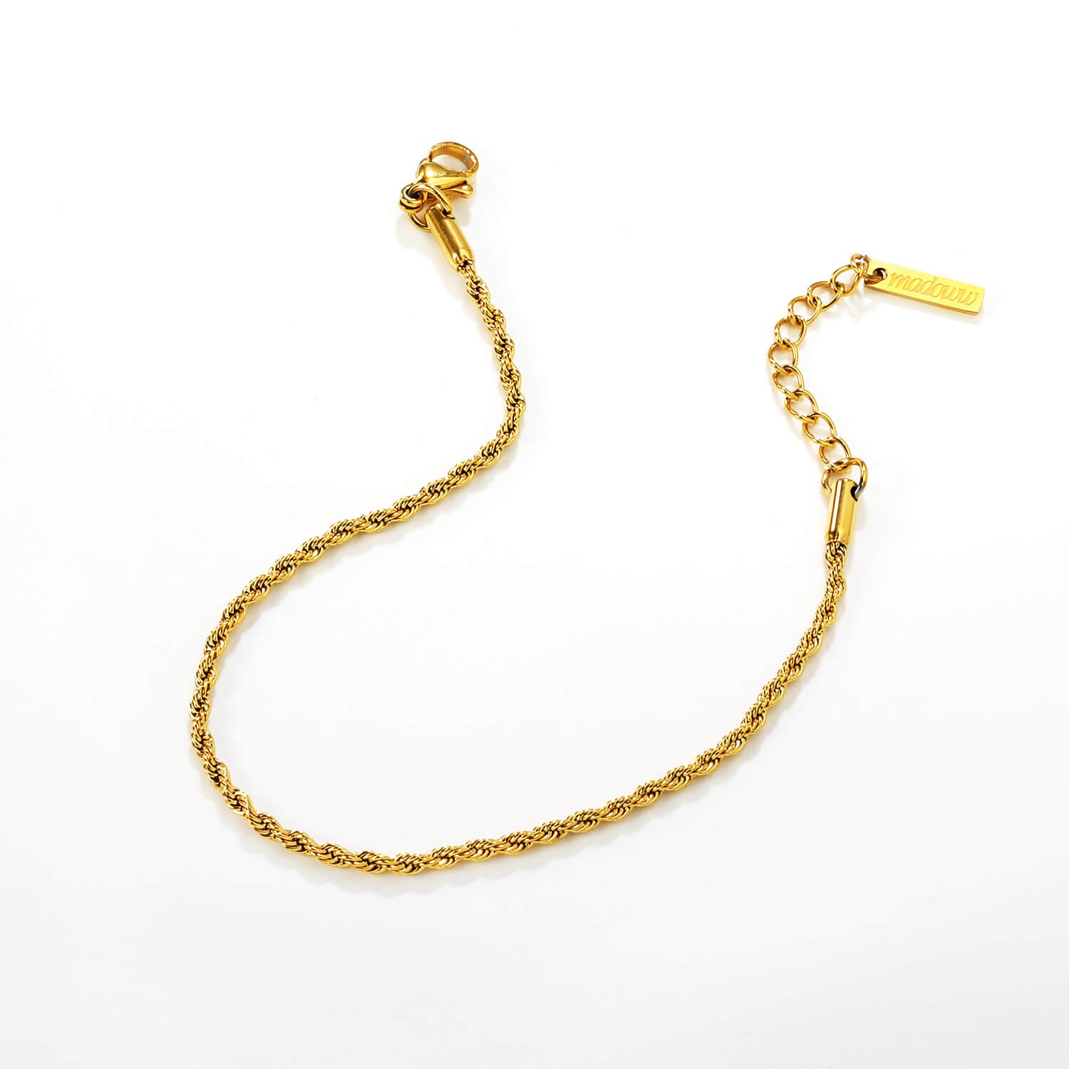 Kullattu rannekoru rope chain tyylinen valkoisella taustalla. Madoww brändin vedenkestäcvä ja hypoallergeninen.